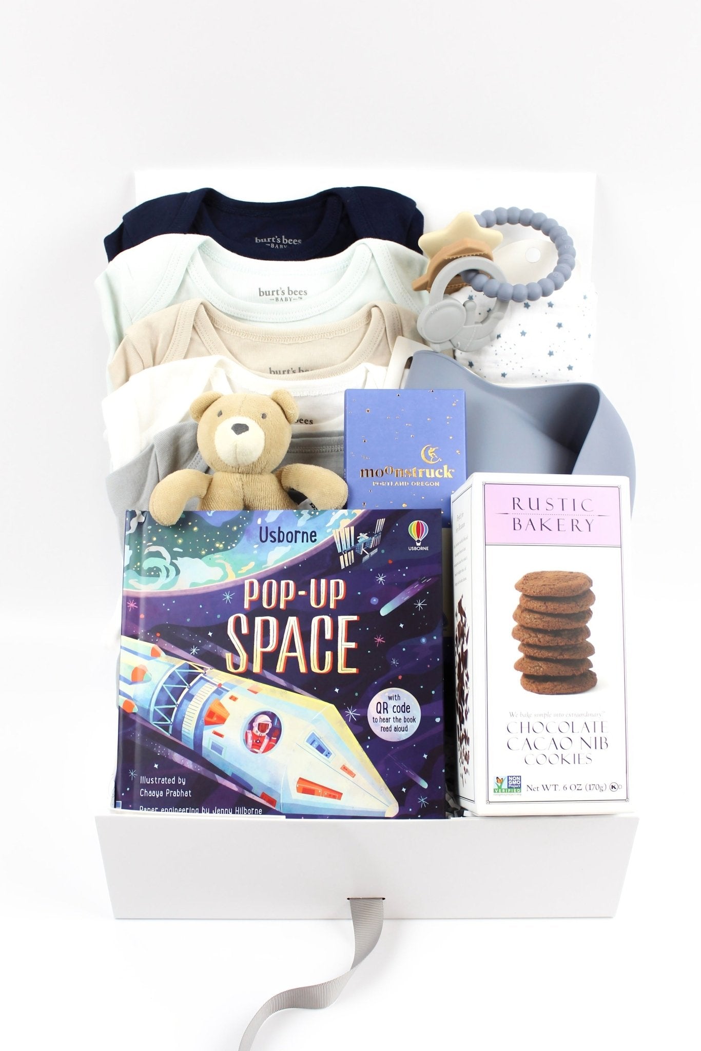 This space themed box is sure to delight space enthusiast parents. Featuring essentials for baby and treats for parents.