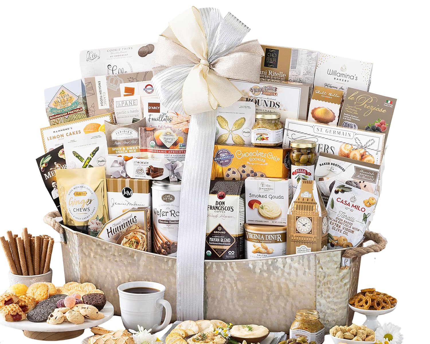 Overflowing with sweet and savory snacks like vanilla fudge with sea salt, organic Mayan blend ground coffee, Virginia peanuts, Ahmad English tea, chocolate chip cookies, sesame crackers, hummus, olive tapenade, chocolate hazelnut wafers, cranberry sesame cookies, basil thyme artichoke snacks, lemon cakes, ginger chews, organic dried apricots and much more, this is the gift basket to send to show them just how much you care. This is the new parent gift basket to wow the gift receiver.