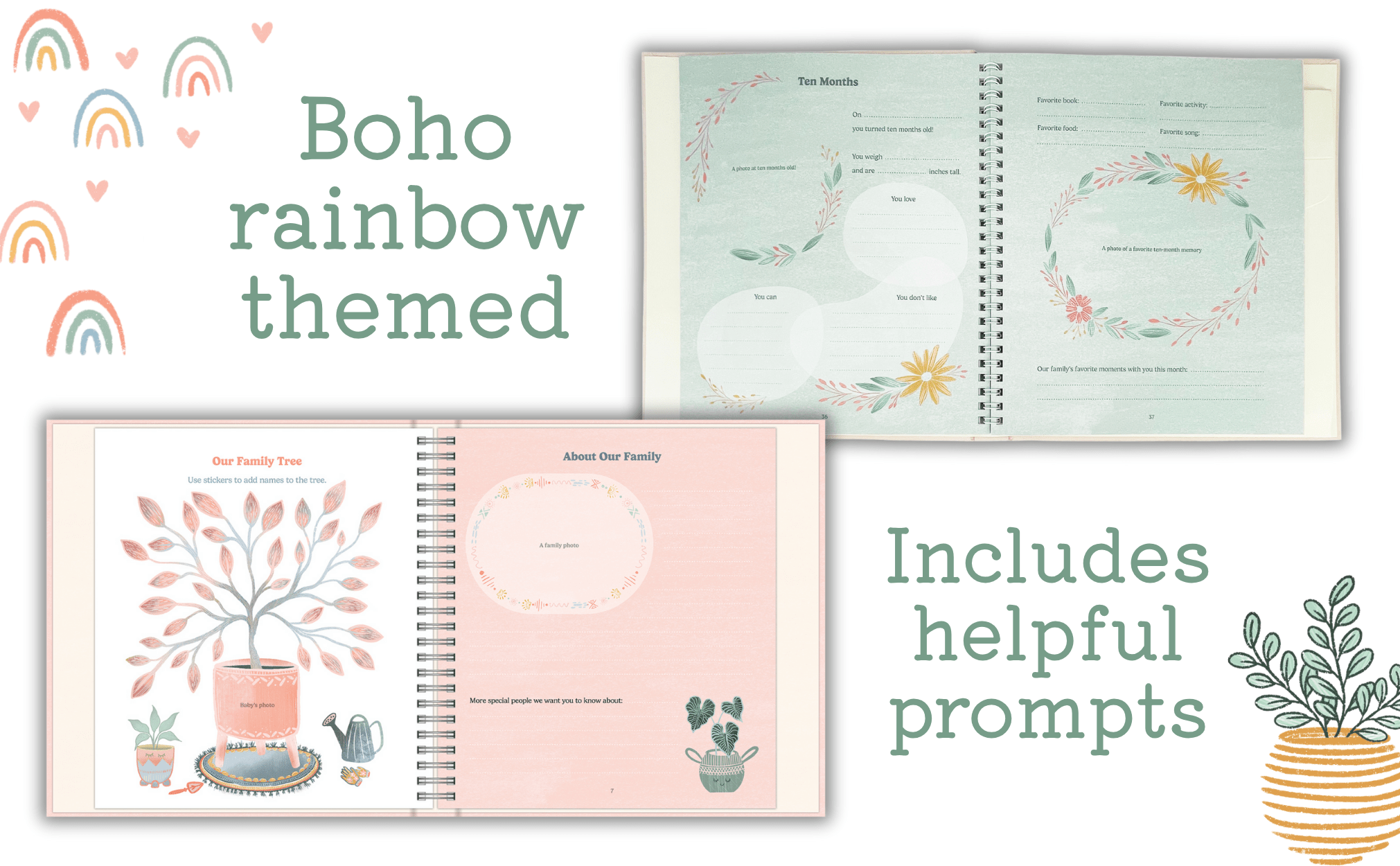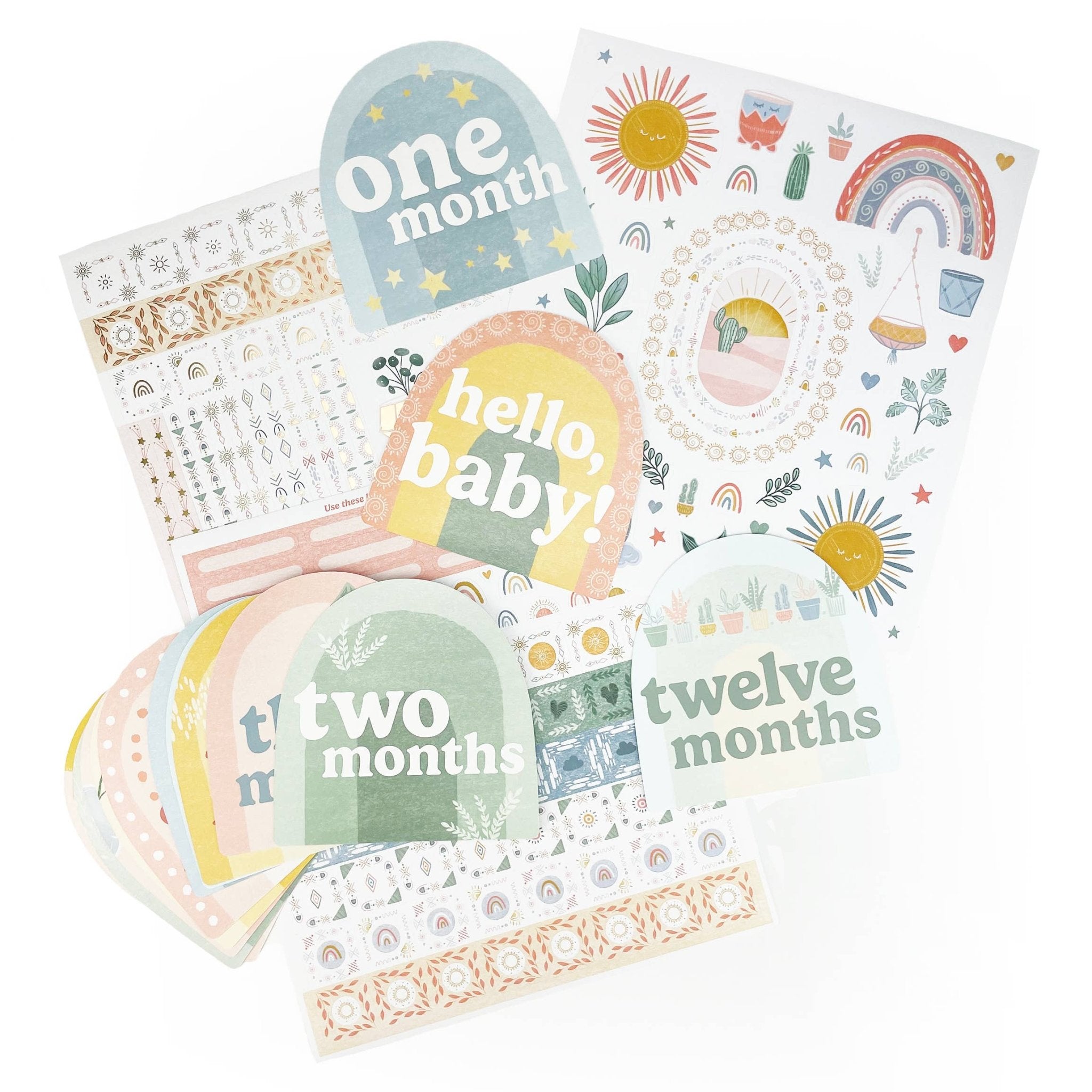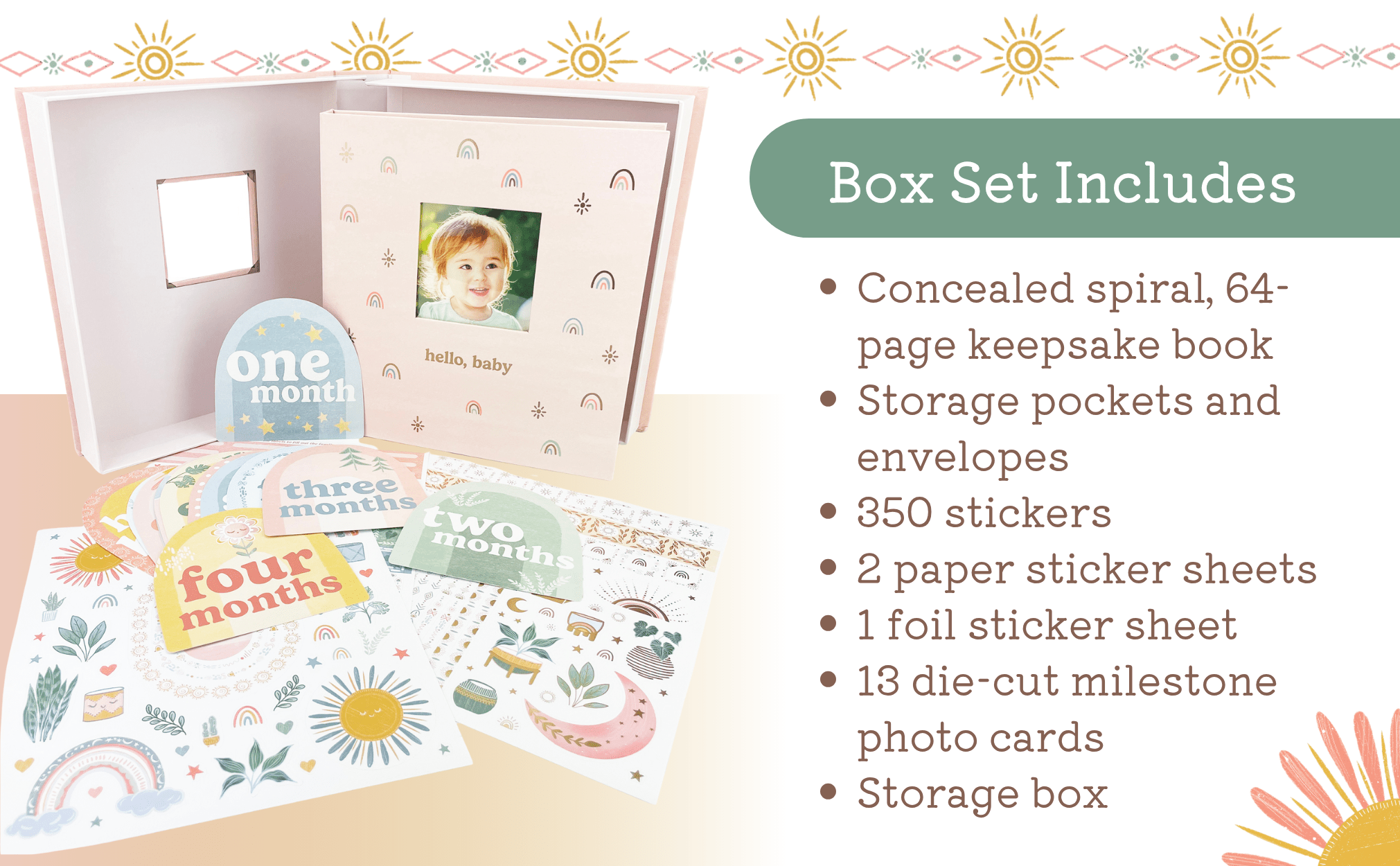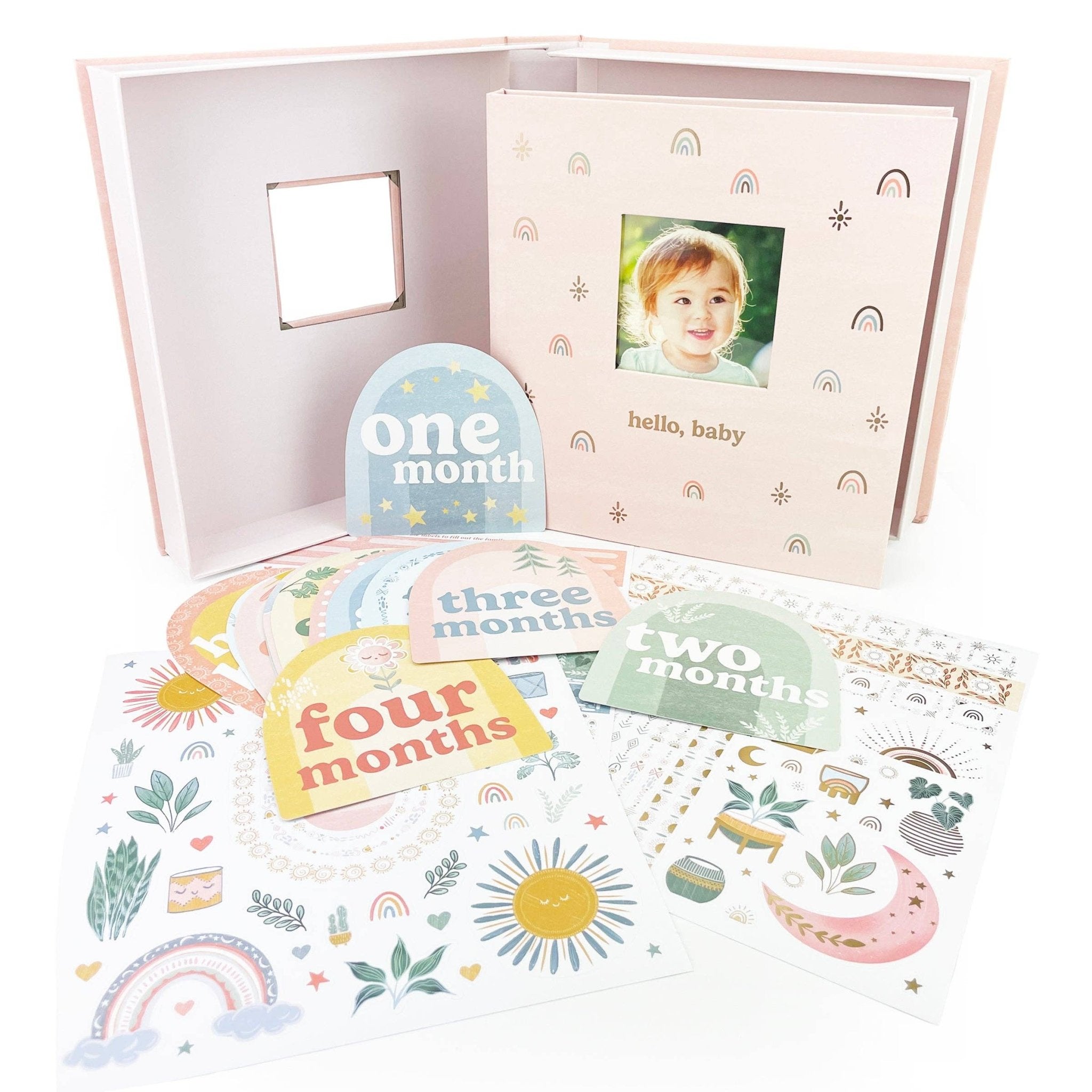 Charming keepsake boxed set for your baby's moments and milestones includes a baby book for photos and journaling, stickers for scrapbooking, 13 monthly photo markers, and storage box for mementos. Personalize the cover with a photo of your baby, and use helpful prompts to write about birthdays, firsts, family, feelings, and more. Monthly entries for the first year, then pages for the years two and three. This Boho, rainbow-themed baby book is perfect for your little girl. A must have for any expecting parents.