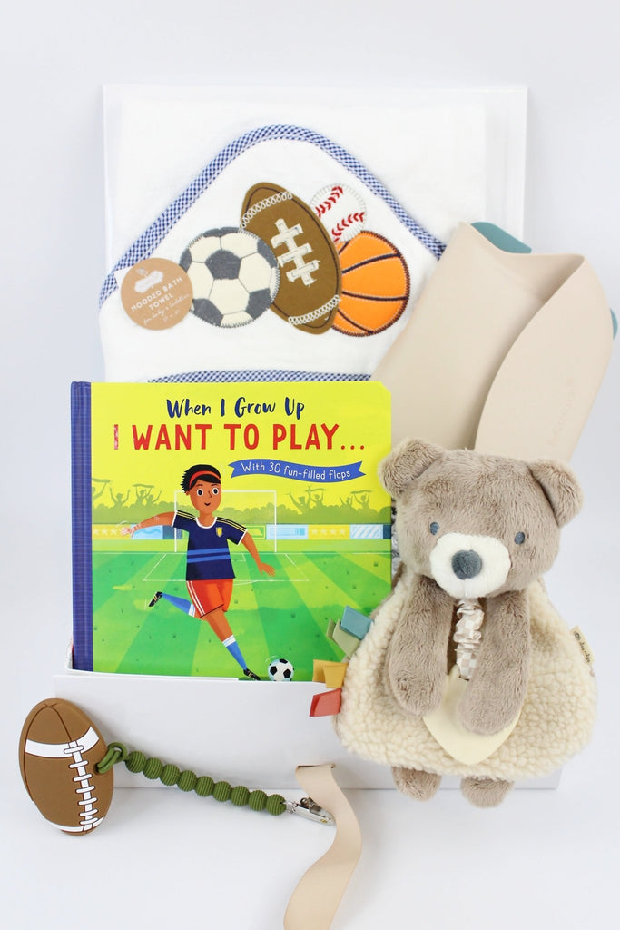 You'll find baby essentials in all hues from white, creams, greys, greens and yellows in this section of our baby gift sets. Perfect to gift as a gender-reveal gift, baby shower gift, baby gift to a client and more.