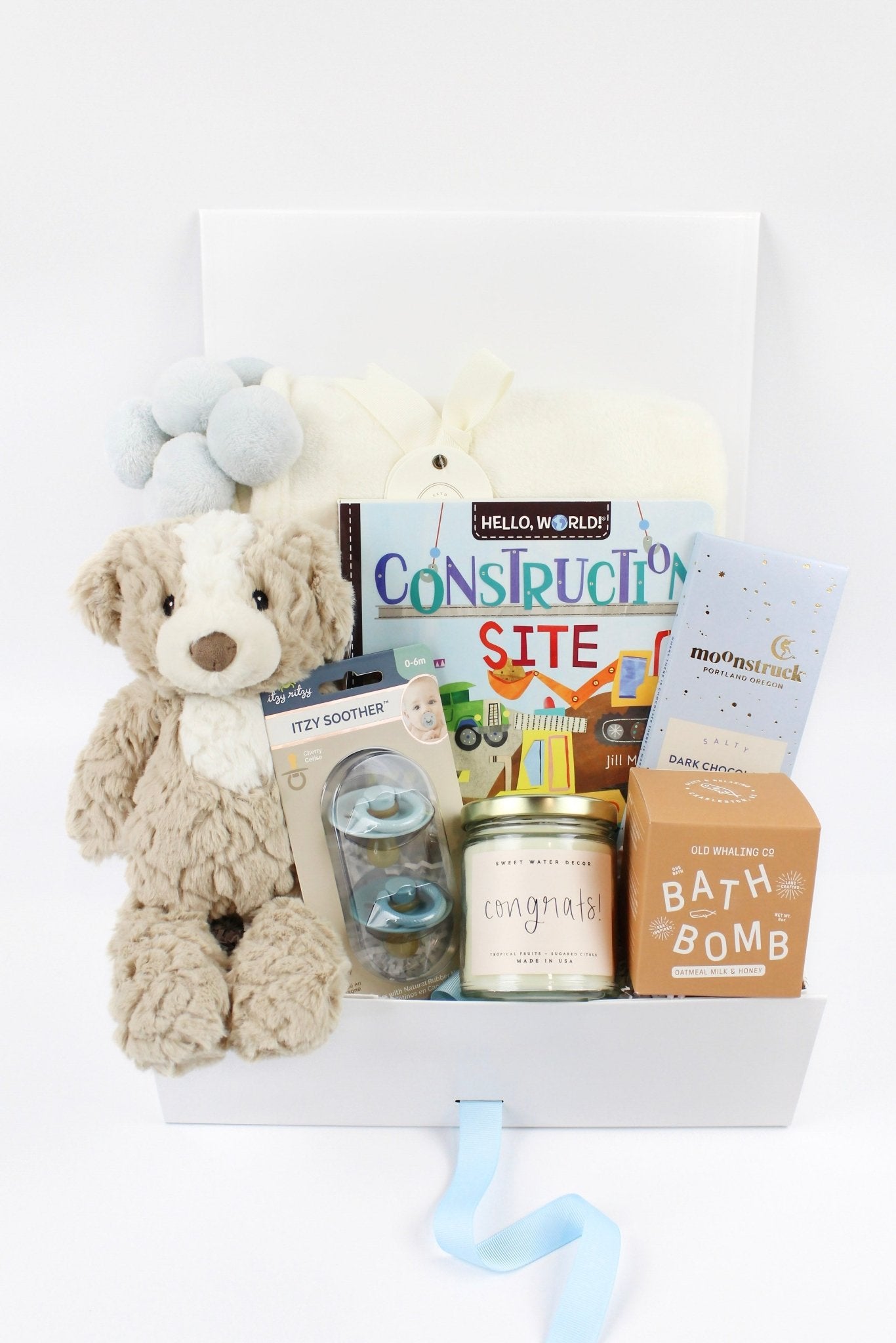 Welcome Baby Boy Gift Box is a must-have set to celebrate the new arrival of a baby boy with something for mom, dad, baby, and a big sibling too. Includes an Ecru Blanket made of 100% polyester fleece (30" x 40") with poms, bound with ribbon; a colorful board book about construction sites; an elegant and modern Nursery Hound toy by Mary Meyer in muted tan & white with embroidered eyes; Old Whaling's Oatmeal Milk + Honey Bath Bomb with Epsom salt, oils, and oats; a Dark Chocolate Almond bar with 72% cocoa content & vegan ingredients; and a soy-based 'Congrats' Candle with notes of tropical fruits and sugared citrus. All comes in a beautiful box with card.